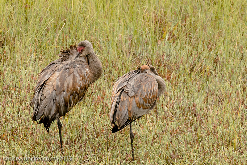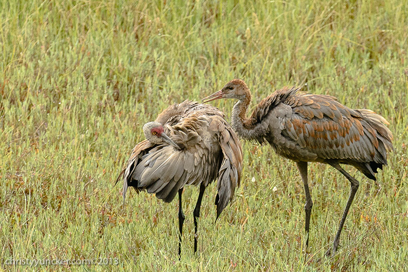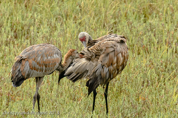 Individual cranes frequently preen their own wing and back feathers. We have never seen Millie and Roy preen one another but preening of another individual (allopreening) is common in parrots. On several occasions in September, when Millie, Roy, and Pi were preening themselves, Pi touched Millie's back feathers, seeming to investigate the uropygial (preen) gland near the base of her tail. Millie discouraged PI's investigations.