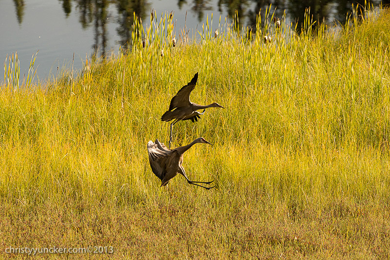 The cranes signal each other so that they take flight together. First Millie and Roy purr, next align in then same direction, and then lean forward in the Intent-to-fly posture. Generally the parents are the first to lift off. Sometimes, as in the second image below, Pi took the lead position as they crossed the pond.