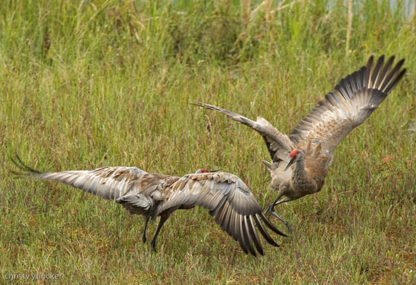 For cranes, graceful and forceful dancing springs from nature and nurture; genes are important but so is learning. For each species, the basic postures and the style of the dance and have genetic bases. However, details of the steps of a display, use of dramatic plumage, and choreography differ among species. Males are generally more dashing and females more reserved, yet both participate vigorously and respond powerfully. On another webpage, we have offered a preliminary dictionary of Sandhill Crane dance steps.