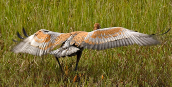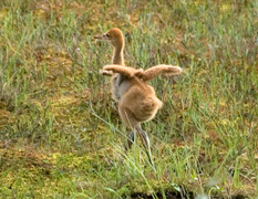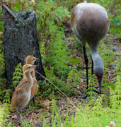 - Caution - In their first weeks, colts are especially vulnerable. The parents are particularly wary when ravens, northern harriers, or mew gulls are nearby. Whenever a predator is detected, colts crouch down in the grass, often under their mother. If the predator approaches, the parents defend vigorously, as seen in the left photograph which shows Millie shielding the colts (Jacques-09 and Phyl-09) and Roy Bill-stabbing at a mew gull. The mew gulls had nested within 30 meters of the crane nest. By midsummer, their gull chicks had become colt food and the adult gulls deserted the pond.