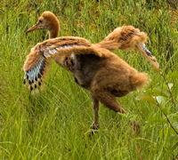 - Foraging - As parents pace slowly and forage, the colts (Peter Pan-04 at 3 weeks in the left image) run after them waving their wings. They often cross water channels which the colts must swim. By week 4 (right above) , colts show pinfeathers.