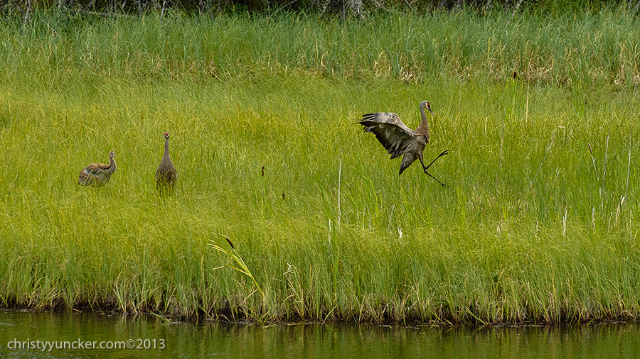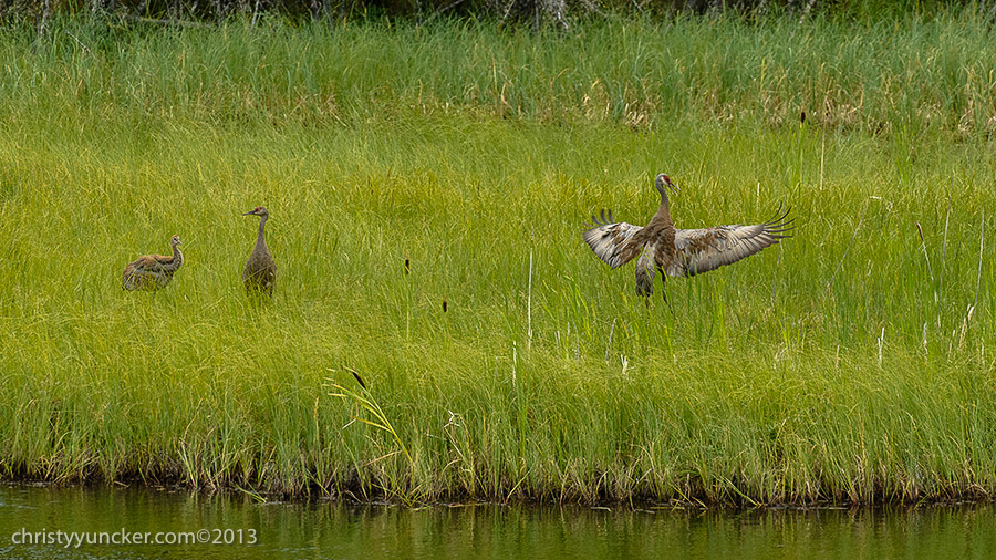 Through June and most of July, Millie and Roy walk with their colt while they forage.In late July, Roy and/or Millie begin to fly short demonstration flights across the nest territory, as Pi watches, sometimes spreading and flapping his wings.