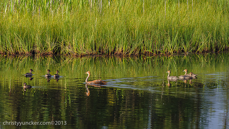 Reports of Sandhill Cranes swimming are sparse. We have found no accounts of cranes swimming in staging areas such as along the Platte River.