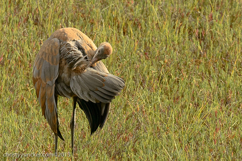 Individual cranes frequently preen their own wing and back feathers. We have never seen Millie and Roy preen one another but preening of another individual (allopreening) is common in parrots. On several occasions in September, when Millie, Roy, and Pi were preening themselves, Pi touched Millie's back feathers, seeming to investigate the uropygial (preen) gland near the base of her tail. Millie discouraged PI's investigations.