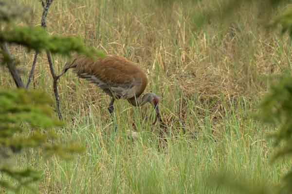 In 2002, the pair erturned in early May and nested. A face-off between crane and fox took place in mid-May. Nest defense was successful that year, since we spotted a small crane colt in mid-June. The Mew Gulls and Bonaparte's Gulls harassed the crane family as they wandered about the marsh. At the end of June, the colt had disappeared.
