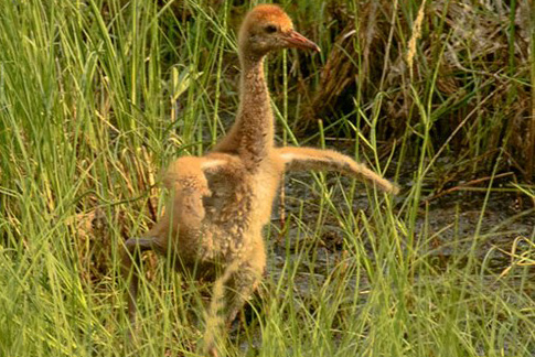 Arrow '15 and Pi '13 work hard in "ground school" as they practice wing flapping and gliding across the marsh.